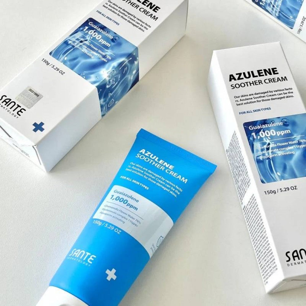 Dr SANTE Azulene Soother Cream je hydratační krém pro citlivou pokožku, známý svým vysokým obsahem azulenu mezi estetickými značkami. Obsah 1 000 ppm guaiazulenu nejvyšší kvality dodává produktu přirozenou modrou barvu bez umělých barviv a poskytuje silné zklidňující, hydratační a ochranné účinky. Produkt využívá heřmánkovou květovou vodu jako hlavní bázi namísto obyčejné vody, což pomáhá pleť zklidňovat a obnovovat její rovnováhu, zatímco Salicornia Herbacea Extract a komplex 11 typů kyseliny hyaluronové zásobují pokožku vlhkostí a kontrolují rovnováhu vody a mazu pro zdravější vzhled pleti. Sérum je vhodný pro každodenní použití a zanechává pokožku jemnou, pružnou a zářivou.