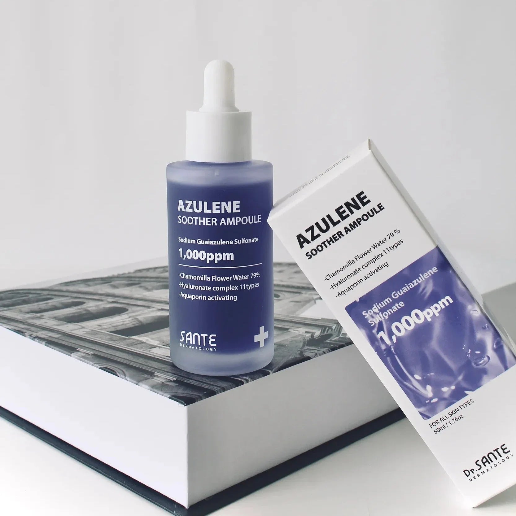 Dr.SANTE Dermatology Azulene Soother Ampoule je hydratační ampule pro citlivou pleť s velmi vysokým obsahem azulenu. Obsahuje 1 000 ppm guaiazolenu nejvyšší kvality a má přirozenou sytě fialovou barvu bez umělých barviv. Ampule silně zklidňuje, udržuje hydrataci a chrání pleť. Extrakt ze slanorožce a 11 typů kyseliny hyaluronové pomáhají hydratovat suchou pleť, vyrovnávat vodno-mazovou rovnováhu a podporují zdravější vzhled pleti.